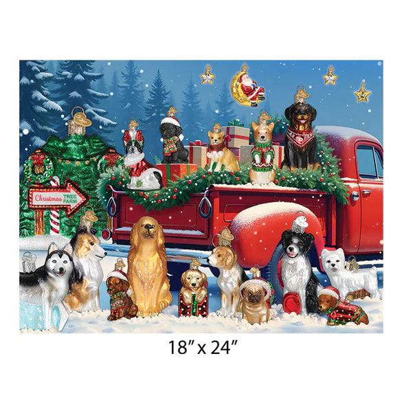 Celebrate the magic of the season with our festive Furry Frenzy Puzzle, where over a dozen charming dog breed ornaments gather around a vintage pickup truck beneath gently falling snow at a cozy Christmas tree farm. This heartwarming winter night scene is brought to life in a beautifully crafted 500-piece premium puzzle with easy-to-handle, clean-cut pieces.
