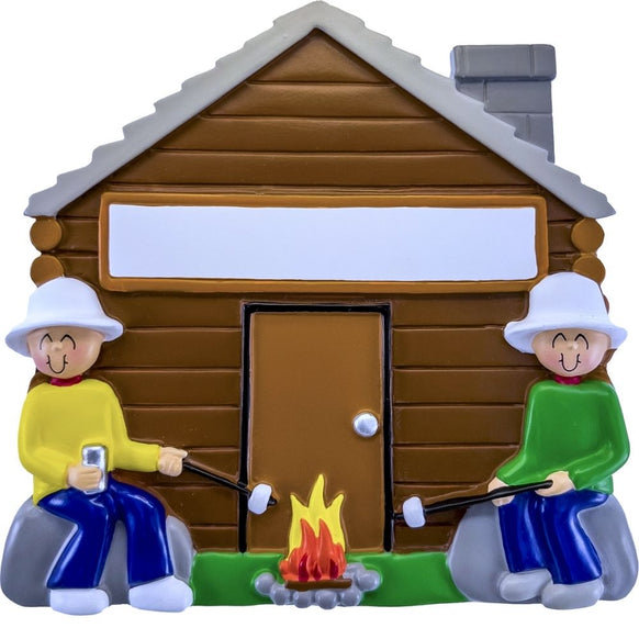 Celebrate cozy getaway memories with this Personalized Cabin Family Ornament. Featuring a rustic cabin, campfire, and two family members roasting marshmallows, this design is perfect for couples or a family of 2 who love camping, cabin trips, and time in the great outdoors. Add a personalized name and year for a festive Christmas ornament.