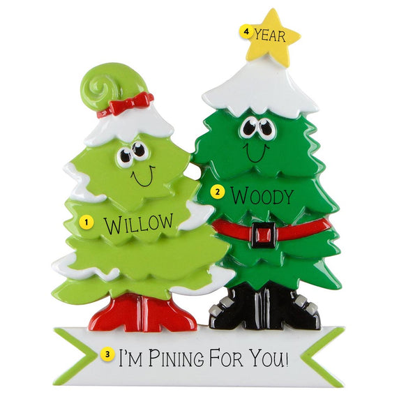 Spruce up your holiday decor with this charming personalized ornament featuring a Christmas tree couple. A playful addition to any tree, this unique ornament can be customized with your names for a fun and festive touch. Spread joy and laughter this season with this one-of-a-kind ornament!