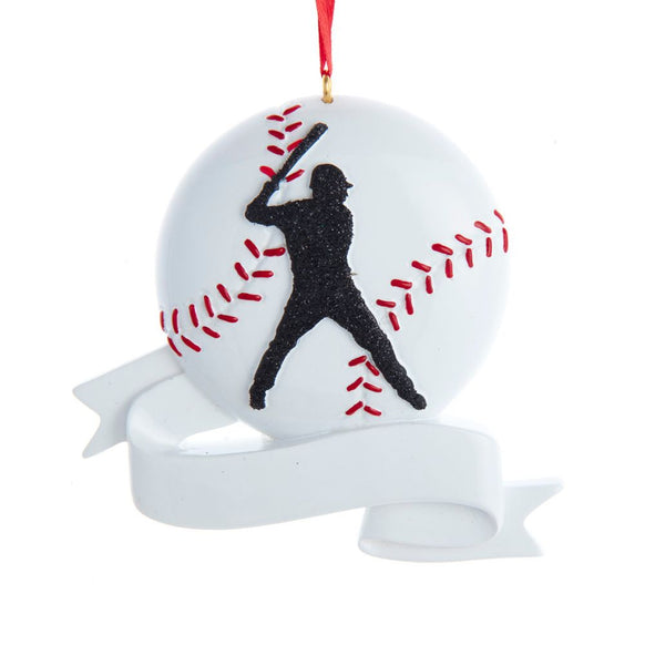 Celebrate your favorite player with this personalized Baseball Silhouette Ornament. Shaped like a classic baseball with bright red stitching, this sporty design features a batter silhouette on the front and a banner for a name and year. It is a fun choice for baseball players, team gifts, end-of-season keepsakes, and families who love spending summer at the ballpark.