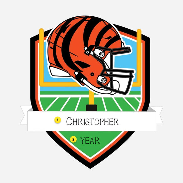 Score a touchdown with this Personalized NFL- Cincinnati Bengals Shield Ornament! Show off your team pride with a custom ornament featuring the Bengals' logo and your name. Add a playful touch to your holiday decor (and maybe even impress your friends) with this unique ornament. Go Bengals! (Sorry, not sorry.)