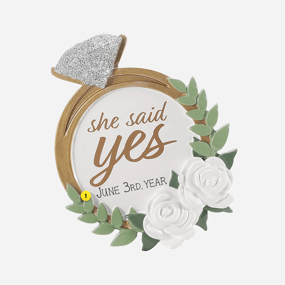 Celebrate the magical moment with our Personalized "She Said Yes" Engagement Ornament! This charming keepsake captures the joy of your engagement and adds a playful sparkle to your holiday décor. Personalize it with your names or special date to make it uniquely yours—a perfect way to relive that unforgettable “yes” year after year.