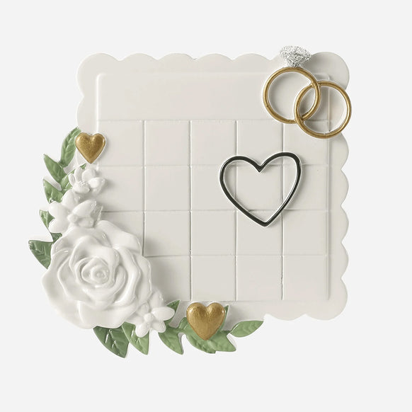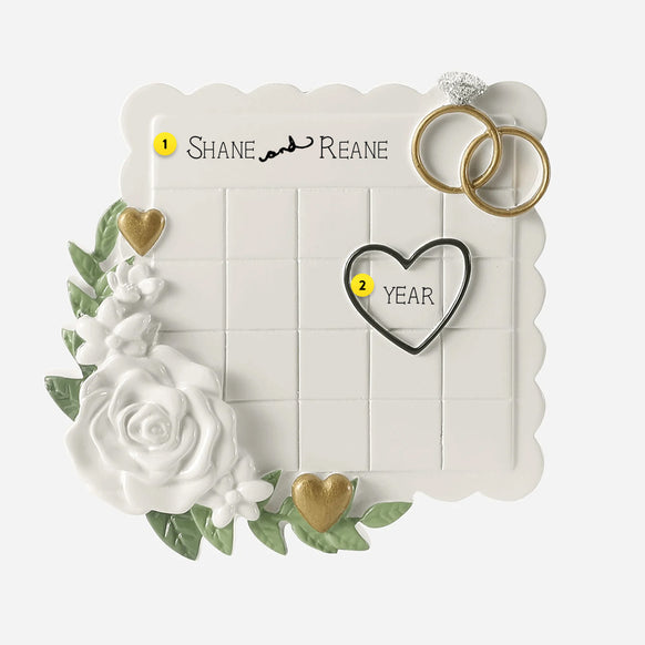 Wedding Calendar Keepsake ornament decorated with rings, heart and rose. Can be personalized.