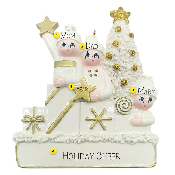 Add a personalized touch to your holiday decor with this whimsical White Christmas family of 3 ornament. It is the perfect addition to your Christmas tree. Make it unique by adding your own family name for a festive and fun touch.